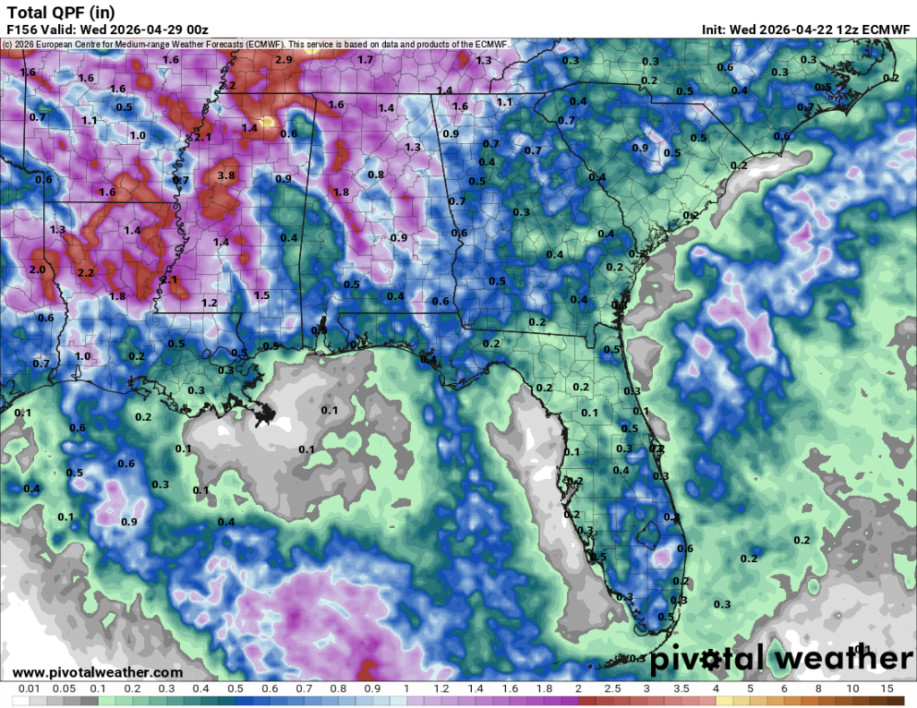 Saturday’s not looking like a washout, but we can expect some scattered showers across the Pine Belt and MS/AL coast in the mid-morning to early afternoon. It’s going to be a warm and humid day with a high in the mid 80s and partly to mostly cloudy skies. We’ll have a break from the rain on Sunday, however it’s going to be very warm with a high in the upper 80s. As we start the week, rain is likely on Monday through Wednesday. Overall totals look to be around 1.5-2″ which is good news for us. It may not be a drought buster, but it’ll help with fire weather and agriculture.