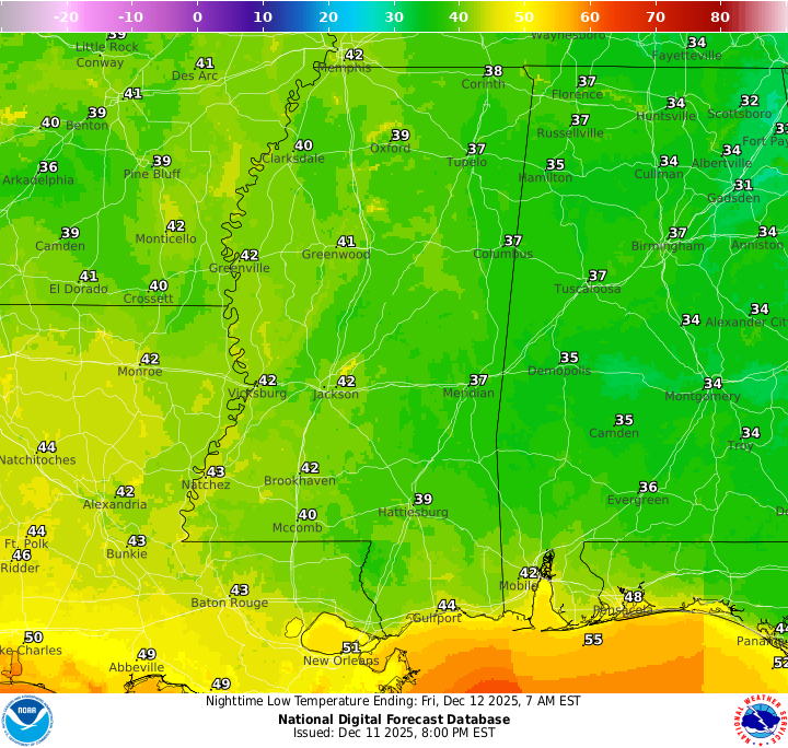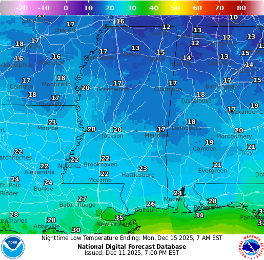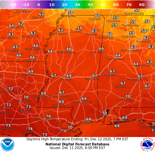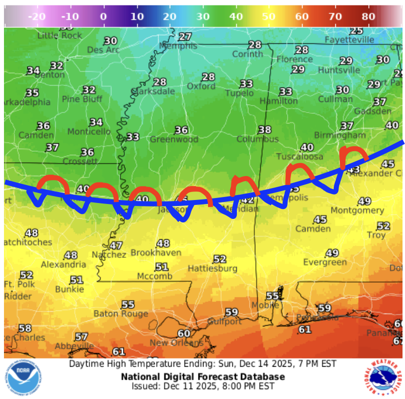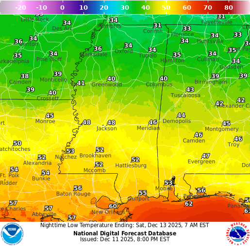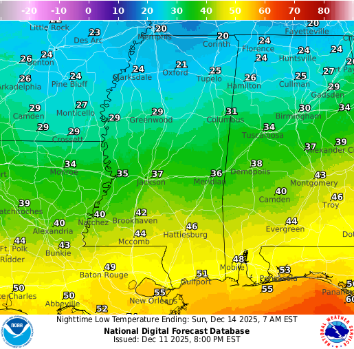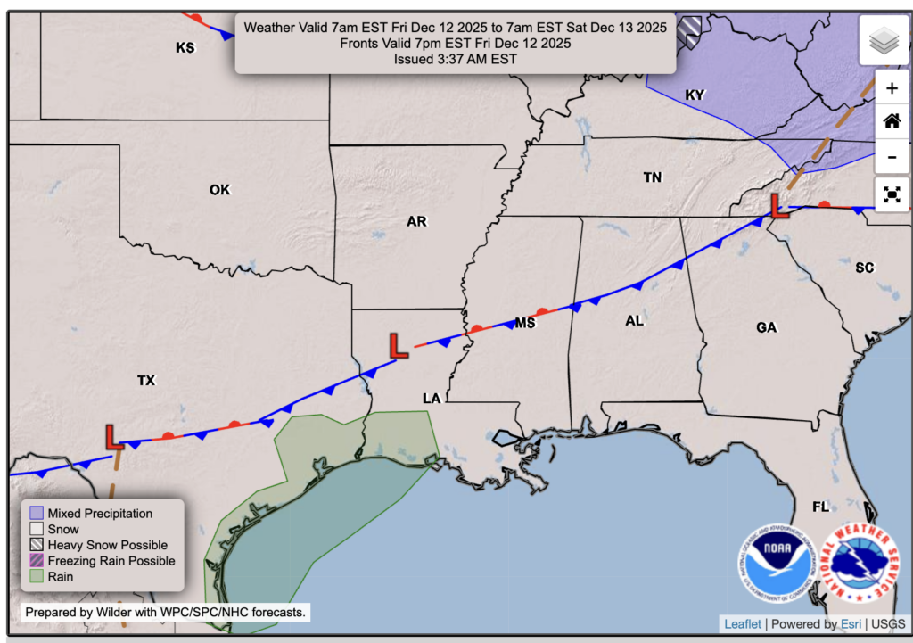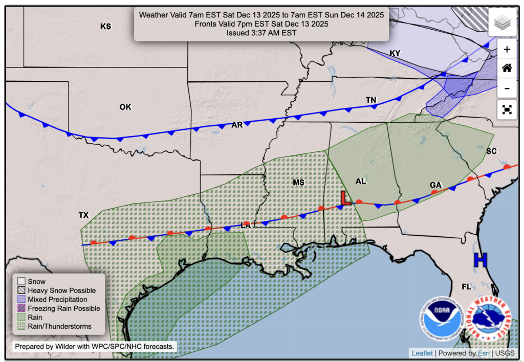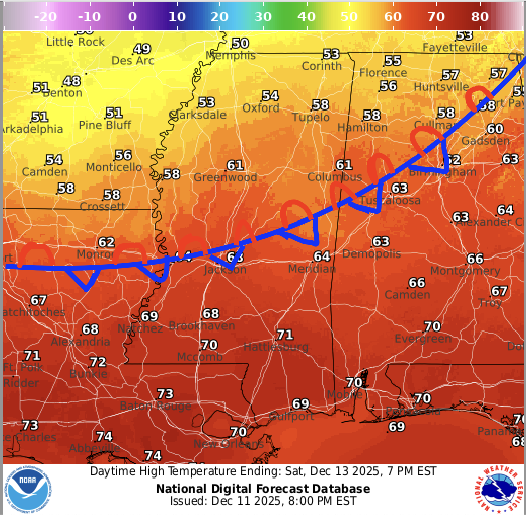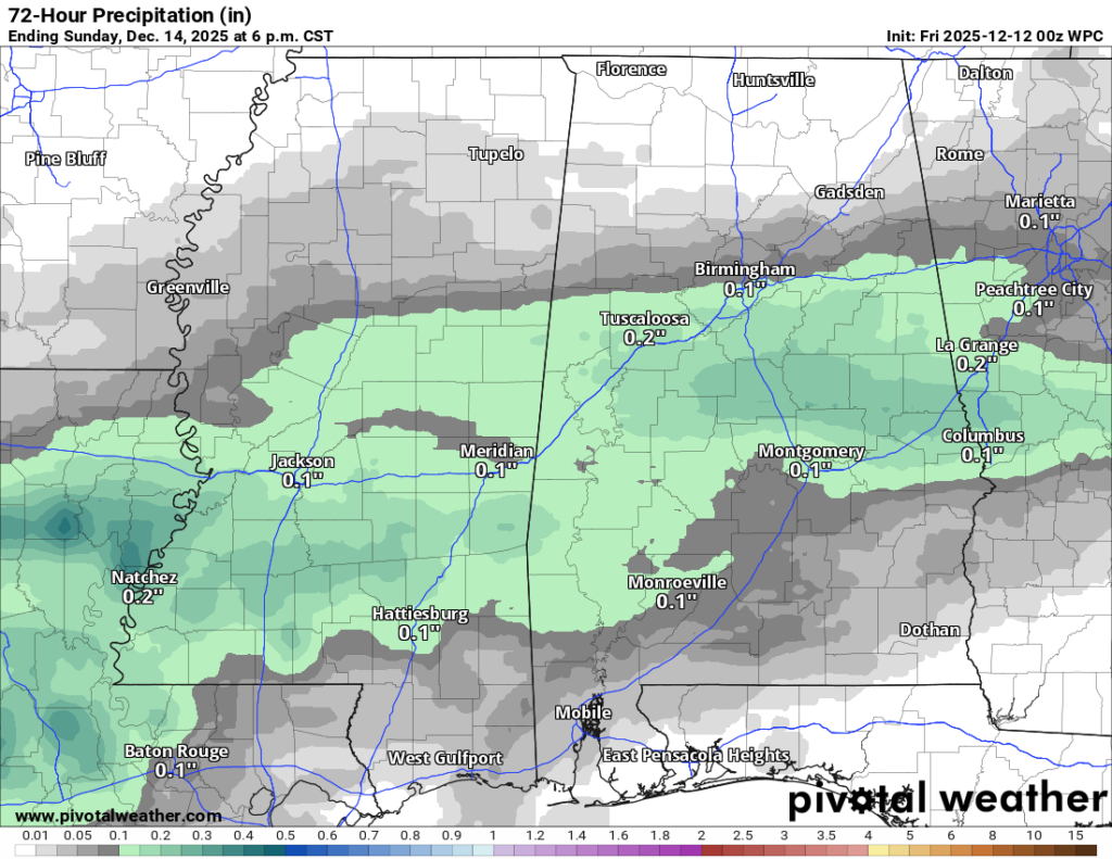Rain Saturday PM into Sunday AM; very cold Monday AM: Southern MS/AL/LA Local Weather Forecast – 12/11/25