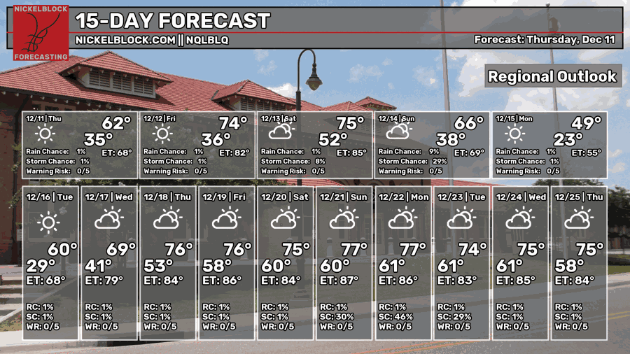 Not a fan of the cold? You have a warmup to look forward to! Mid to late December will include a likely warmup for us, with temperatures for Christmas sitting at 75 degrees, according to our own NQLBLQ model. We’re also looking at some lower precipitation chances after this weekend, so not much in the way of soaking rain at least for a little while.