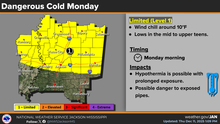 While southern MS, AL, and LA will not see the cold on Sunday, we will be feeling the cold on Monday morning. Temperatures are currently forecasted to reach the lower 20s, with wind chills making it feel like the teens. The NWS has posted a Limited (Level 1/4) threat on the Dangerous Cold scale for those folks in Vicksburg, Jackson, Meridian, and areas further north. Ensure you are prepared on Monday morning and the kids are all bundled up for school. A chilly high for Monday as well, only in the mid-40s!
