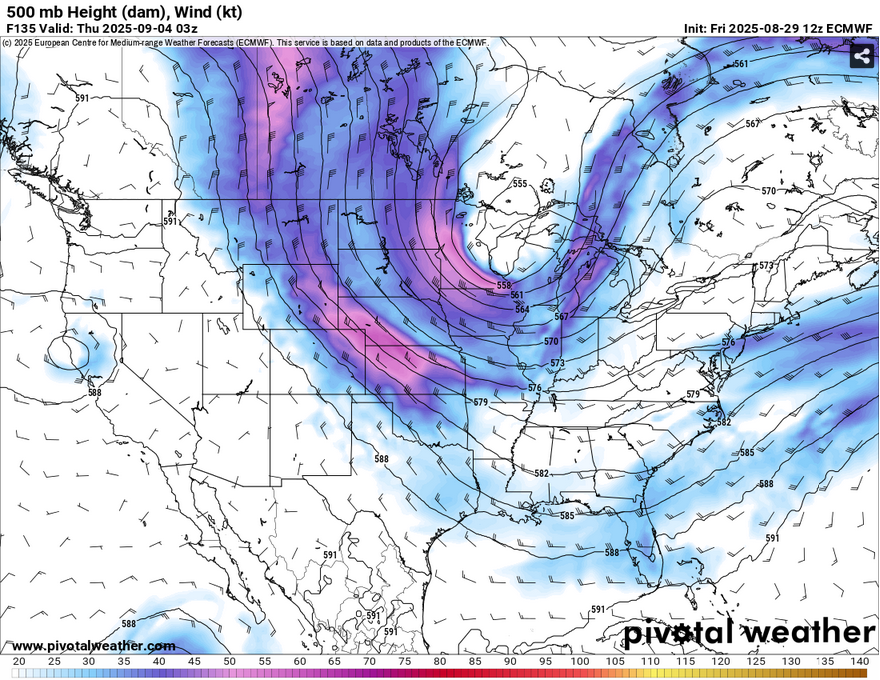 500mb height and wind showing a large shortwave trough over the western Great Lakes on Thursday //Courtesy: Pivotal Weather