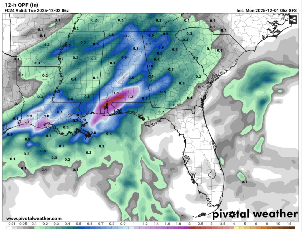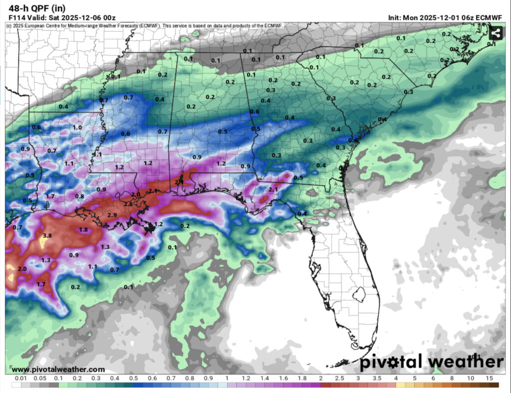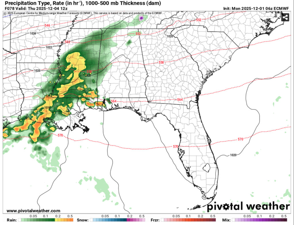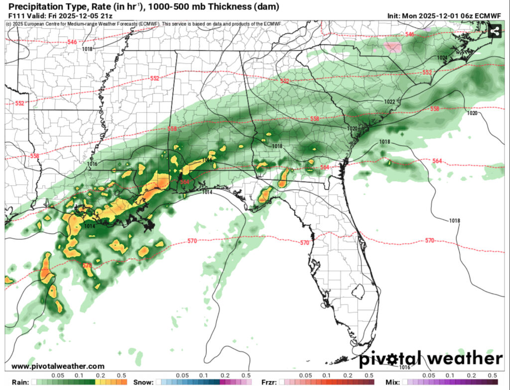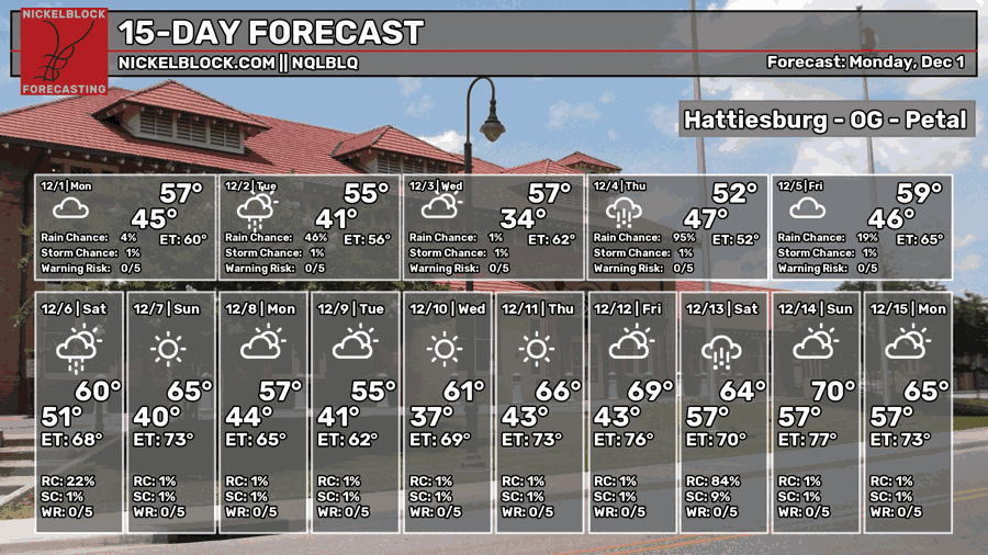 Another round of rain is likely beginning early Thursday morning for much of the Deep South. Another Gulf low will move in bringing moderate rain across the area. This will persist through to Friday and part of Saturday as it moves slowly along the coastline. This doesn’t look to be much of a thunderstorm event so far, but we can expect over an inch of rain for much of the Pine Belt and much higher for the coastal areas. Highs will reach the upper 50s to low 60s and lows in the low to mid 40s.