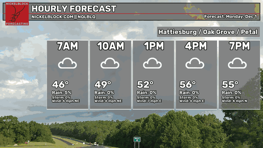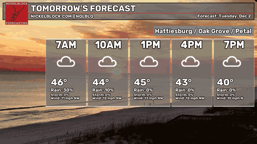 We’ll have mostly cloudy skies today with a high in the mid 50s. Rain chances won’t arrive until the evening hours for much of the Pine Belt. Afterwards, we’ll fall into the mid 40s with rain until the mid-morning hours.