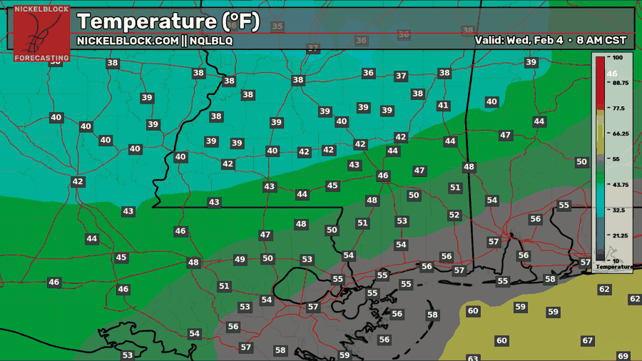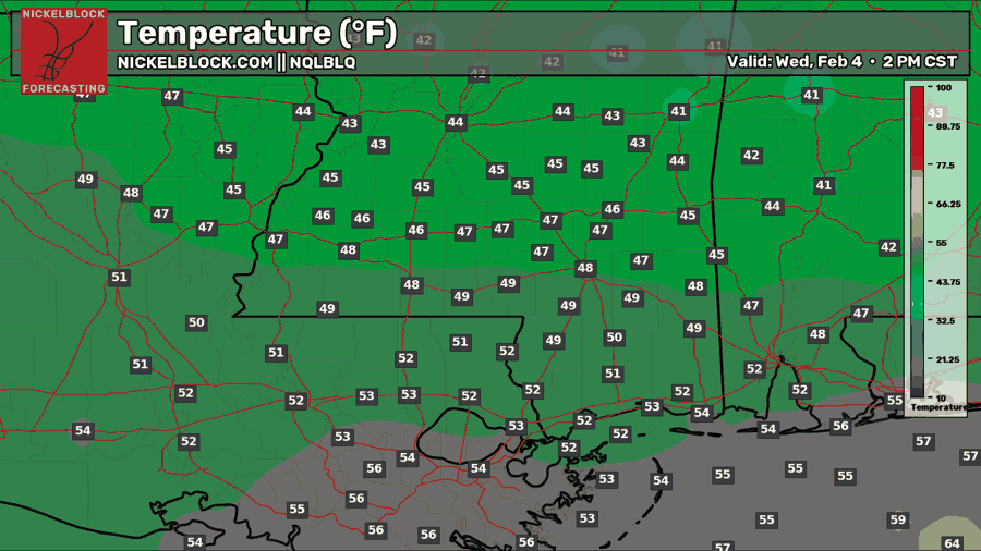 Tonight, there will be a large range of low temperatures, depending on your location. Because of the cold front coming through, we will see our low temperature at 8 am. Those further north and west will see a high in the upper 30s, mid 40s near Hattiesburg, and mid-to-upper 50s closer to the coast. Expect light to moderate rain showers through the night.