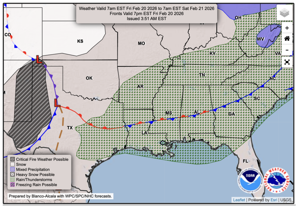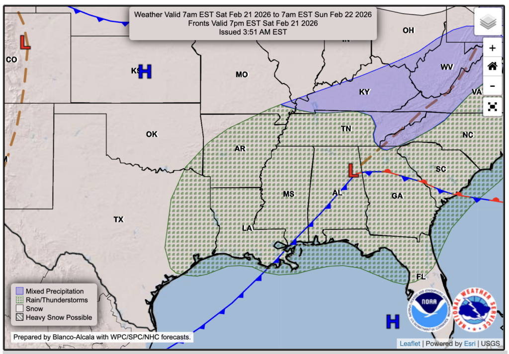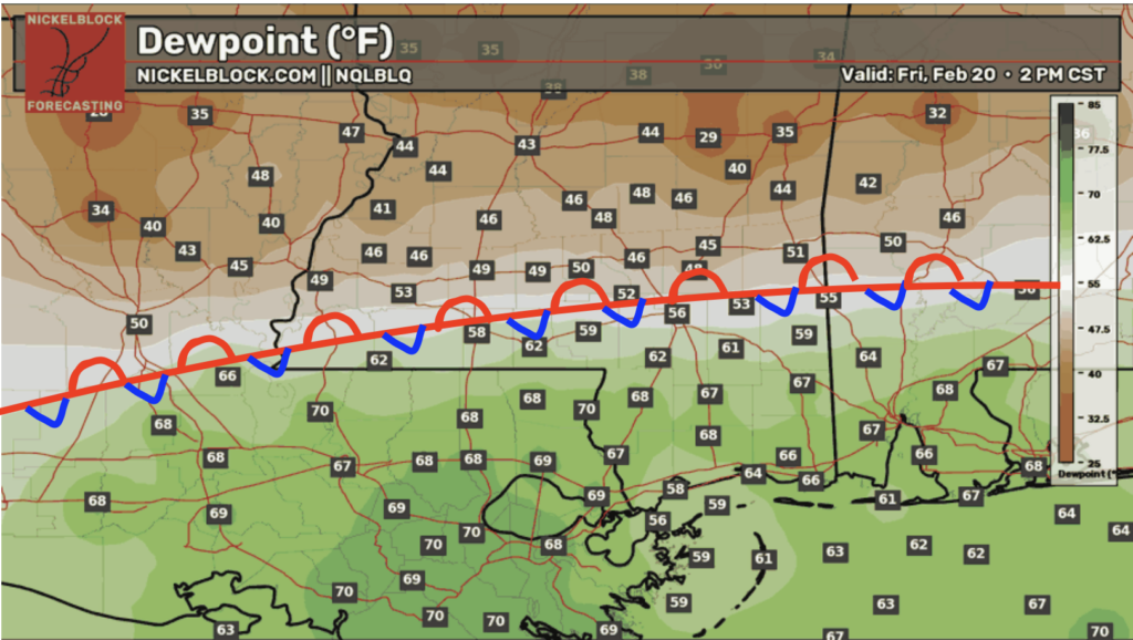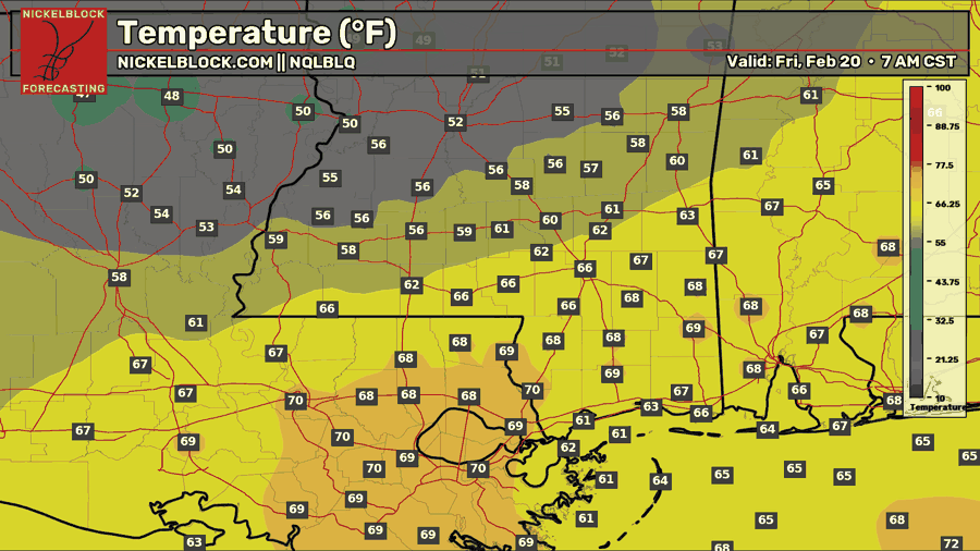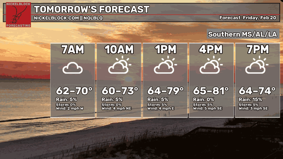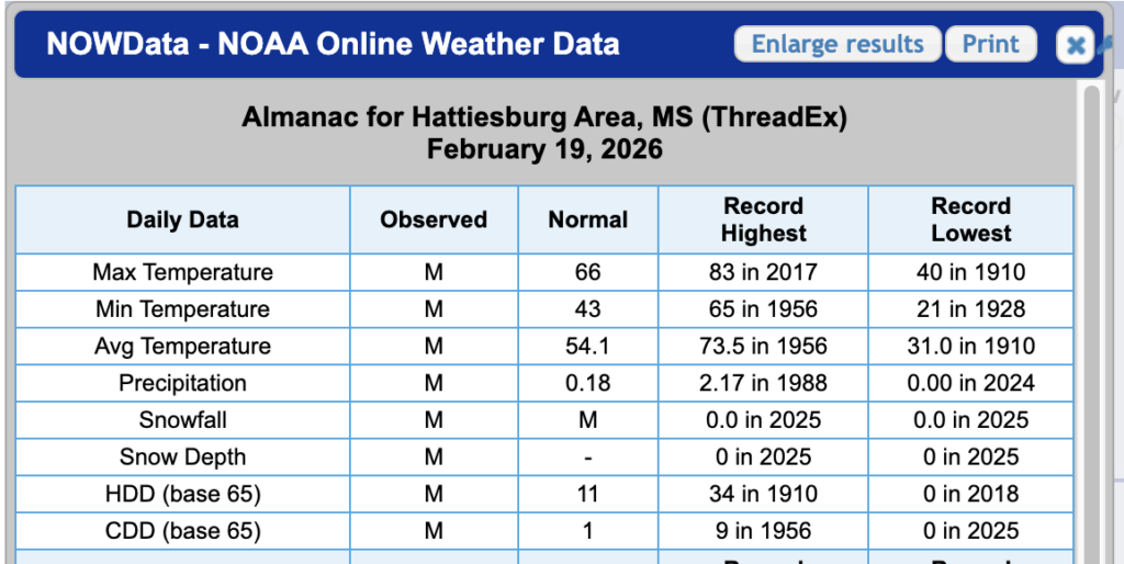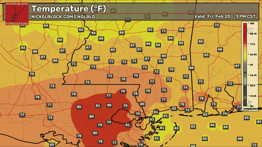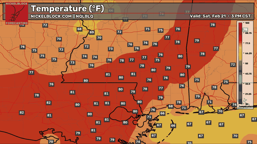 We’ve reached a high of 86 in Hattiesburg today, which officially has broken the record high of 83 set back in 2017! This is remarkable for February, and I have been told it feels like mid-spring in the region. I cannot relate here in Jersey, but I am certainly jealous! Tonight, we could also break a record warm low temperature. We have Hattiesburg at 66, and the record is 65 back in 1956!