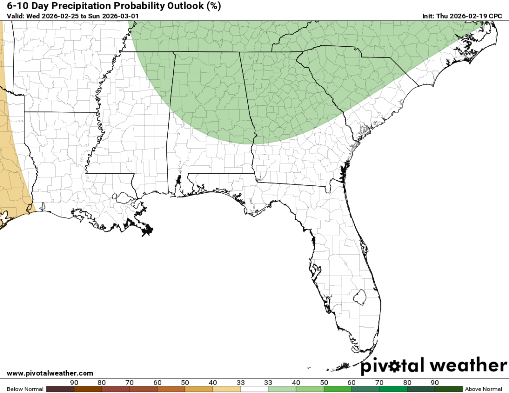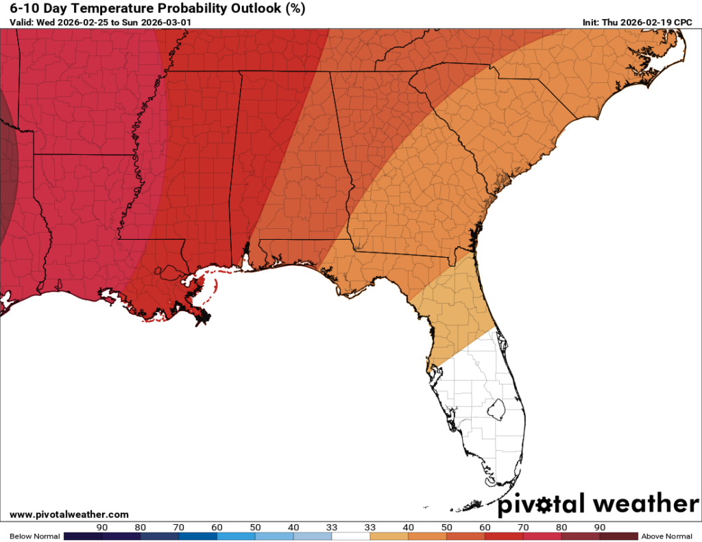 It’ll certainly be a cooler start next week with highs in the upper 50s for Monday and Tuesday. Wednesday warms up to near 70, and then low-to-mid 70s are in the forecast for the first week of March. This is obviously above average, so the CPC shows a very high chance of above-average temps from next Wednesday to next Sunday.