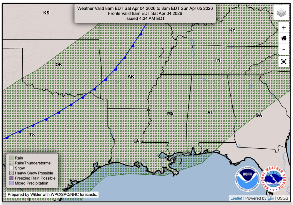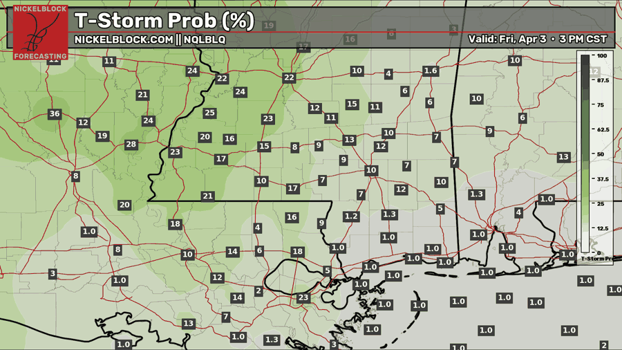 We saw a few heavy showers and isolated thunderstorms today, mainly across southwestern Mississippi and eastern Louisiana. Tomorrow, we could see more of the same, with scattered rain possible through the day as we stay ahead of a cold front pushing through the southern Plains. That front will bring a severe weather and heavy rain threat to areas farther west before moving closer to us by Saturday. As it does, we could see scattered strong-to-severe storms during the day, followed by a line of storms later Saturday night. More on that down below.