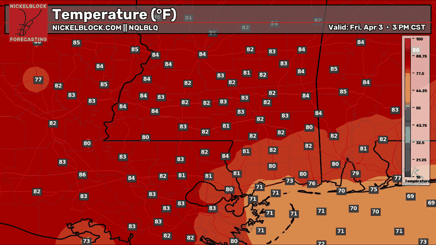 Friday will start off cloudy with that fog threat until around 9 AM. Then skies will gradually clear, and some of that instability could bring some pop-up showers or thunderstorms, which will be very isolated. Like today, there’s a higher probability of these cells popping up over western Mississippi and eastern Louisiana. High temperatures will reach the low-80s, as they have been!