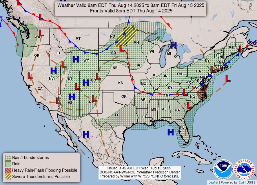 Today: Mix of sun and clouds. Showers and thunderstorms possible, mainly after 5pm. Highs in the mid 90s. West wind around 5 mph. Chance of rain 50 percent.