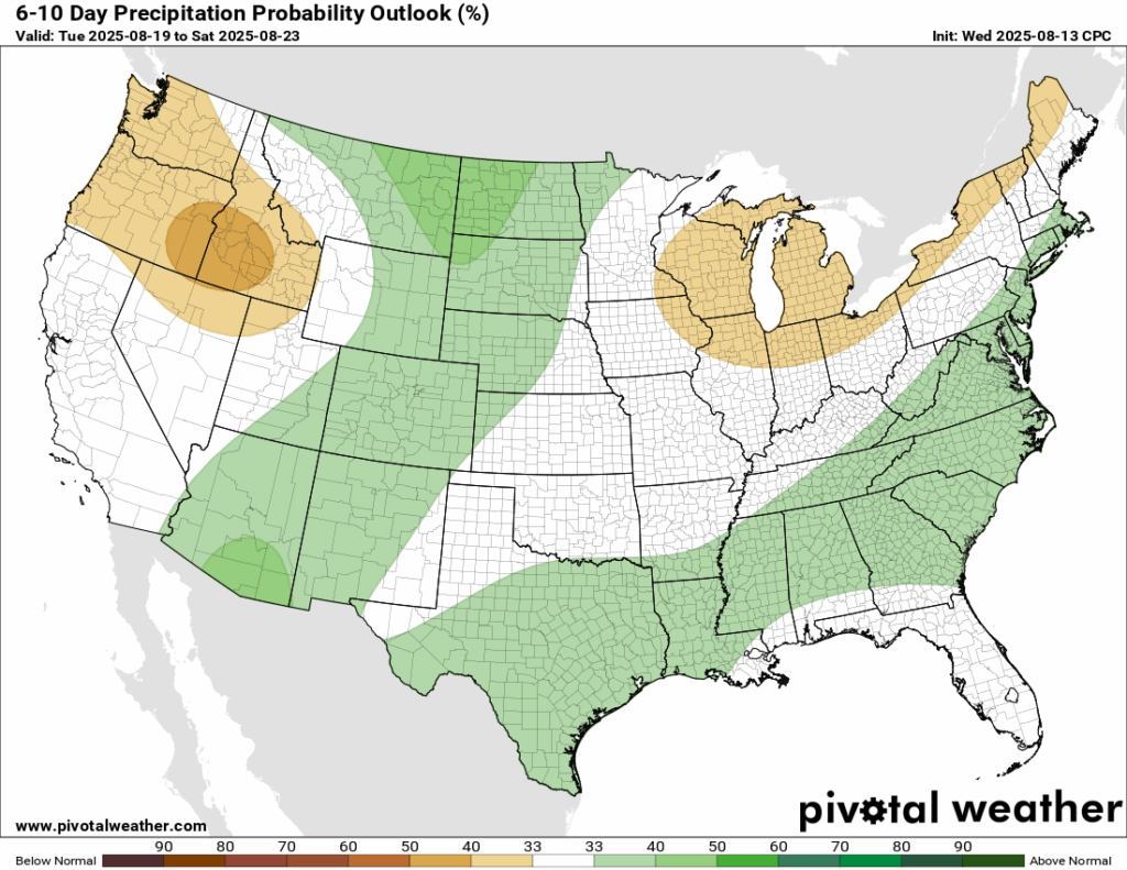 In the 6-10 day timeframe, temperatures are very likely to be above normal for our region, given the ridge that will build up. Some days we could see our high temperatures reach almost 100! The western region will see the most intense part of the ridge, so they have an extremely high probability of above normal temperatures. Rainfall is looking right around average for our region. Much of the same pattern as usual!