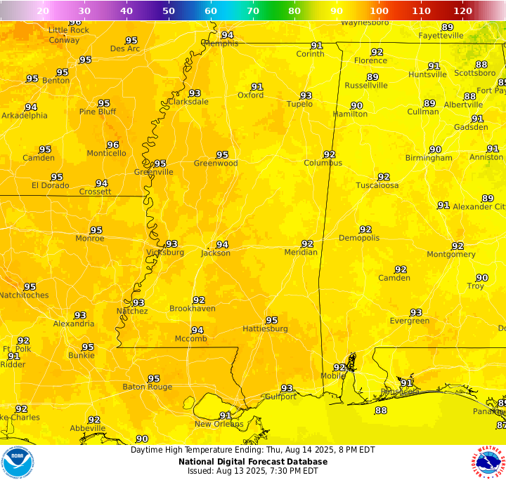 High temperatures today will reach the mid 90s. You’ll notice increased cloudiness today and scattered showers and thunderstorms in the afternoon, with more after around 5pm, ending by midnight. It will feel extremely humid today, with dew points in the mid 70s making it feel like the 110s when there is sun and between rain showers. Keep an eye out on the radar!