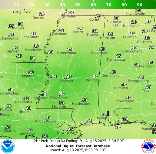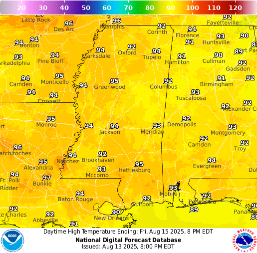 Friday: Mostly sunny. Showers and thunderstorms likely after 1pm. Highs in the mid 90s. Calm wind. Chance of rain 70 percent.