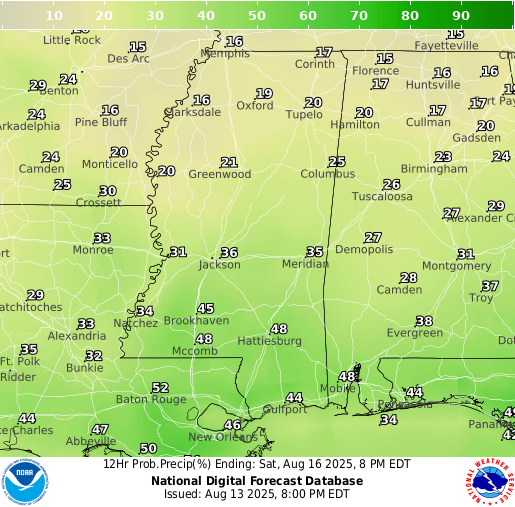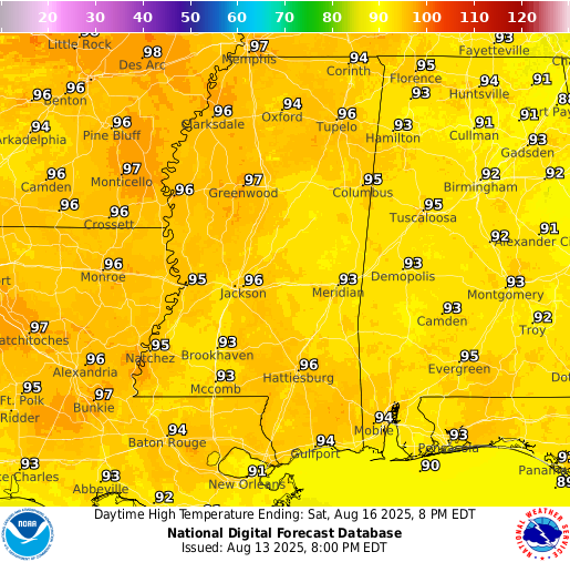 Saturday: Mostly sunny. A chance of showers and thunderstorms after 1pm. Highs in the mid 90s. North northwest wind around 5 mph. Chance of rain 60 percent.