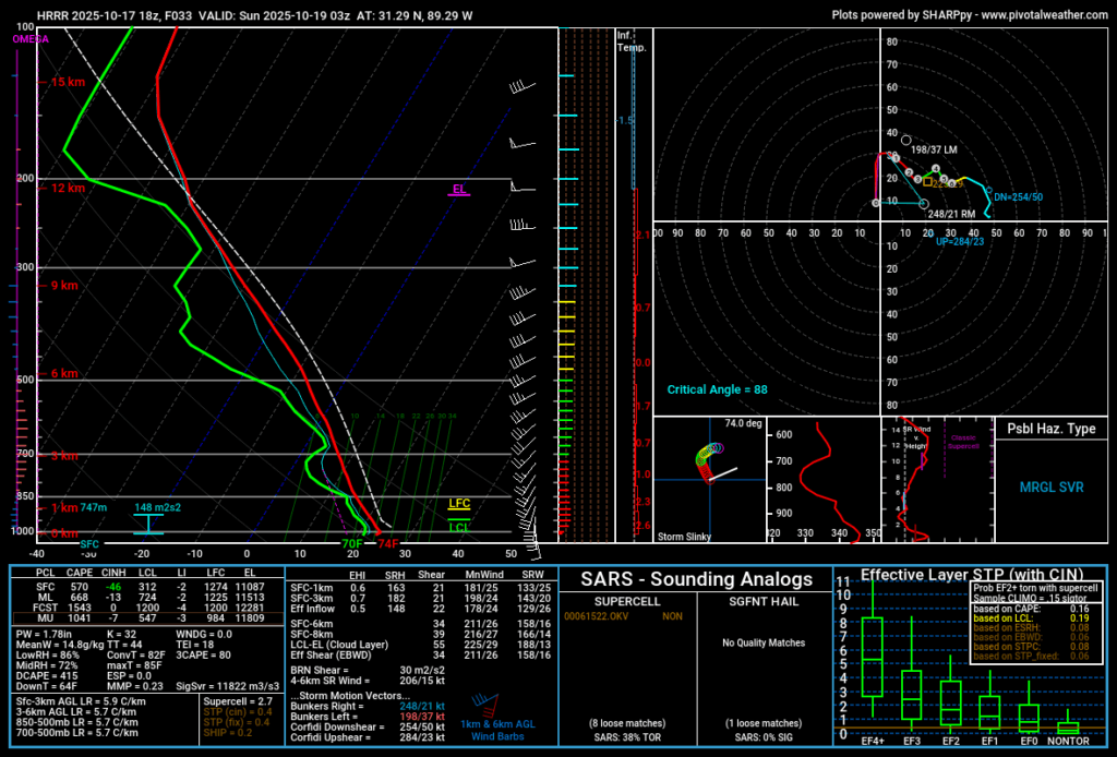 Skew-T’s are showing a decent amount of instability and helicity before the main event begins. Our main concern will be the cluster of storms ahead of the main line which would be the catalyst for a possible tornado and wind threat. So far, the threat remains low, but still possible for one to develop.