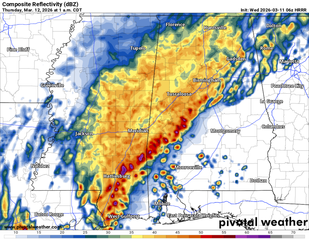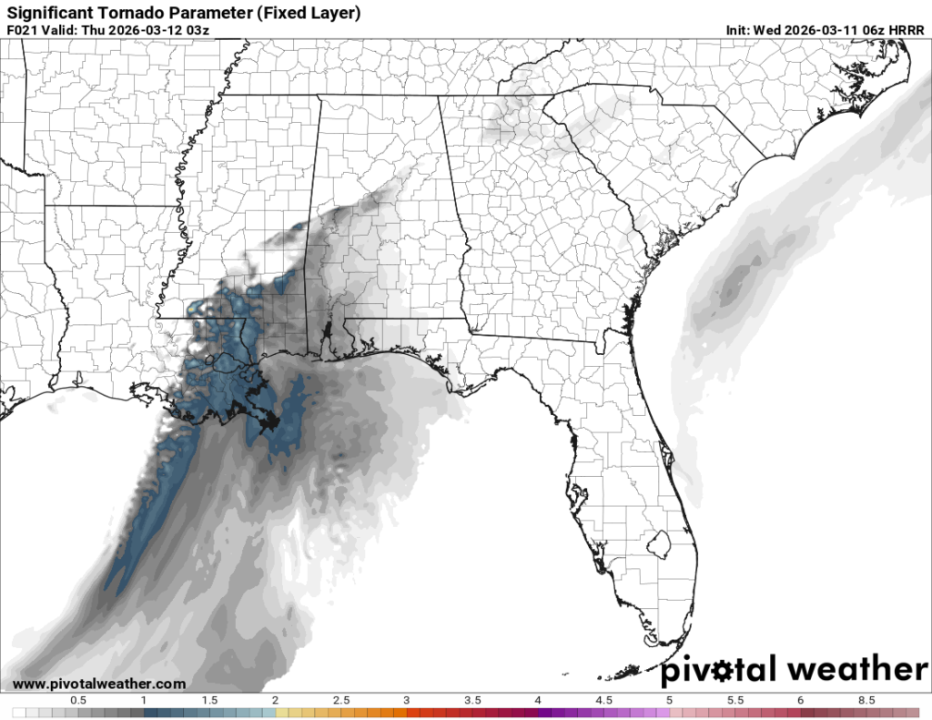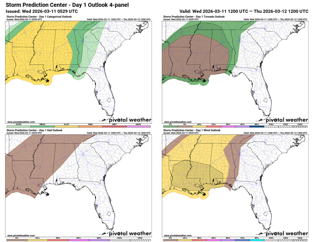 The SPC has put out their Day 1 outlook and expanded the slight (2/5) risk into Alabama. This severe weather event will hit later this afternoon into the evening hours with a chance for straightline winds up to 60mph and tornadoes possible up to EF-2. The chances for tornadoes look conditional and will depend on whether a supercell can fully develop ahead of the main line. Overall, the incoming system has the potential to bring severe weather to parts of Louisiana, Mississippi, and Alabama, but will need the right ingredients to pop off these storms.
