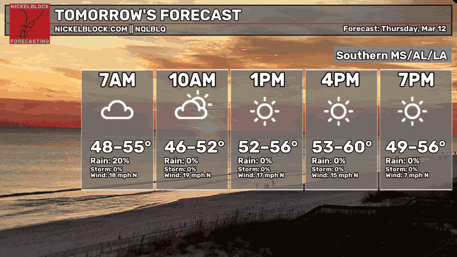 The front on Sunday will keep most of the moisture away from us, however areas in north Mississippi may see some showers and thunderstorms. Overall, it’ll be a warm weekend with a high in the low 80s and lows in the mid 50s on Saturday and the upper 40s by Monday. It’s going to be much cooler on Monday with the incoming cold front, so have your jacket ready!