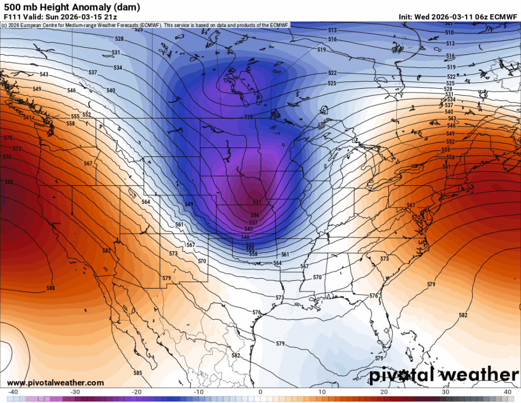 Looking at the upper levels and the surface, there’s another weak front moving through the Great Lakes into the New England area. This won’t mean much for us, however we’ll have another warm couple of days while we wait on the big cold front behind it (seen in Wyoming and Montana above). By Sunday, this front will grow exponentially thanks to a large trough that’s going to mull over the Midwest by Monday.