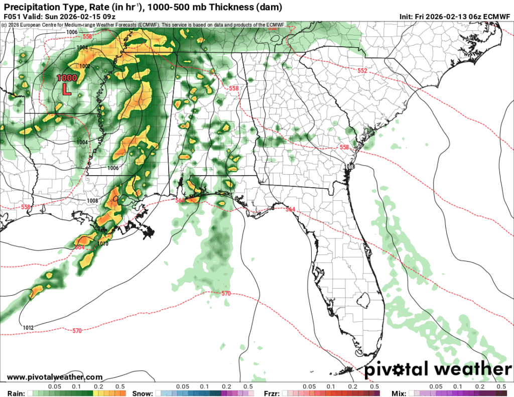 As the low moves over Mississippi, more showers are possible into Sunday afternoon, so bring your umbrella if you’re headed to church in the morning. The rain will taper off by mid-afternoon and clear things up a bit. Temperatures will be in the low 70s during the day and fall into the low 50s overnight.