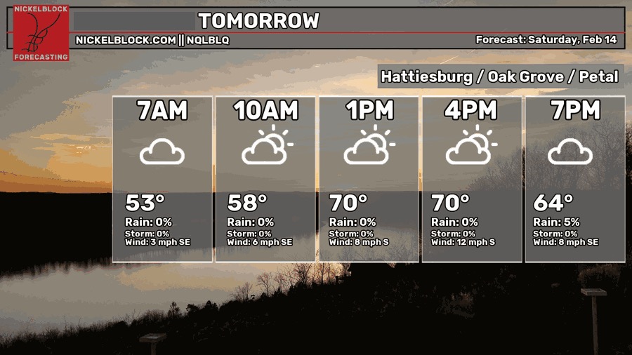 As we go into Valentine’s Day, cloud cover will be intermittent especially as we roll into the evening. Winds will shift back to the south with the incoming front pulling moisture from the Gulf. Temperatures will top out around 70 with some scattered showers across south MS/LA in the afternoon. The main system won’t move in until the late evening for the MS River Valley and around midnight for the Pine Belt. Severe potential is fairly low, but not zero. Tornado potential is low, but we may have to contend with high winds and locally heavy rain.