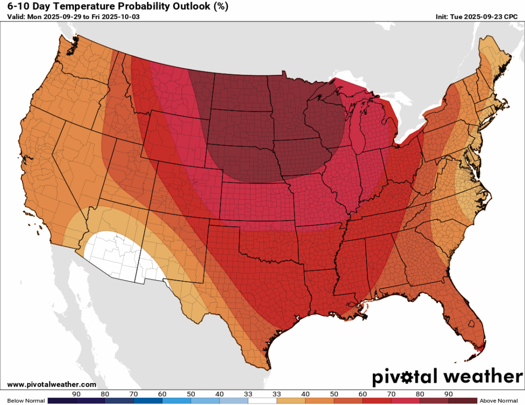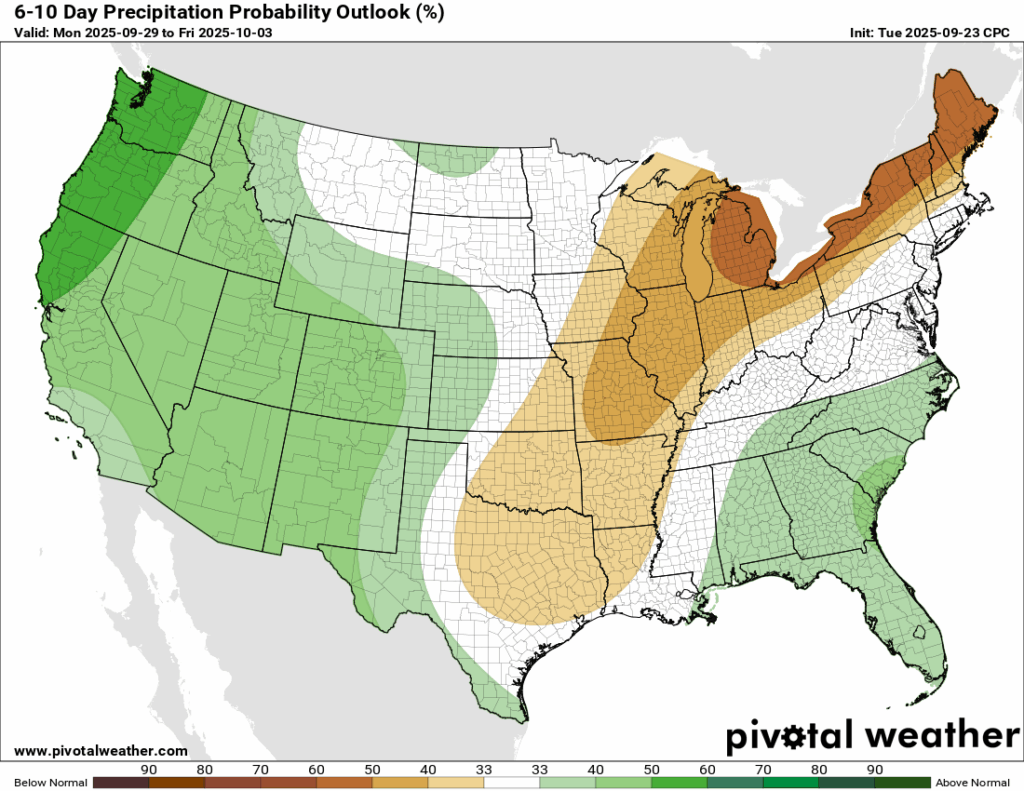 The average high in late September is usually in the mid-80s. Over the next 6-10 days, the CPC outlook keeps most days running a bit warmer than that, but thankfully only slightly above normal. Early October shouldn’t bring a return to the 90s. Rainfall is expected to come in near average, though we’re sitting right on the line between below-normal and above-normal chances