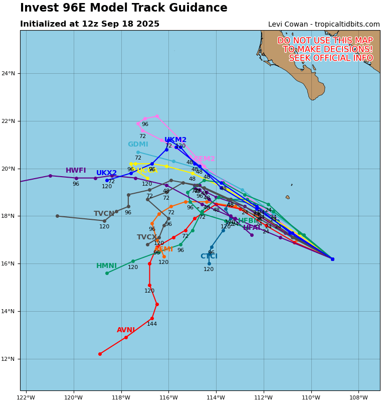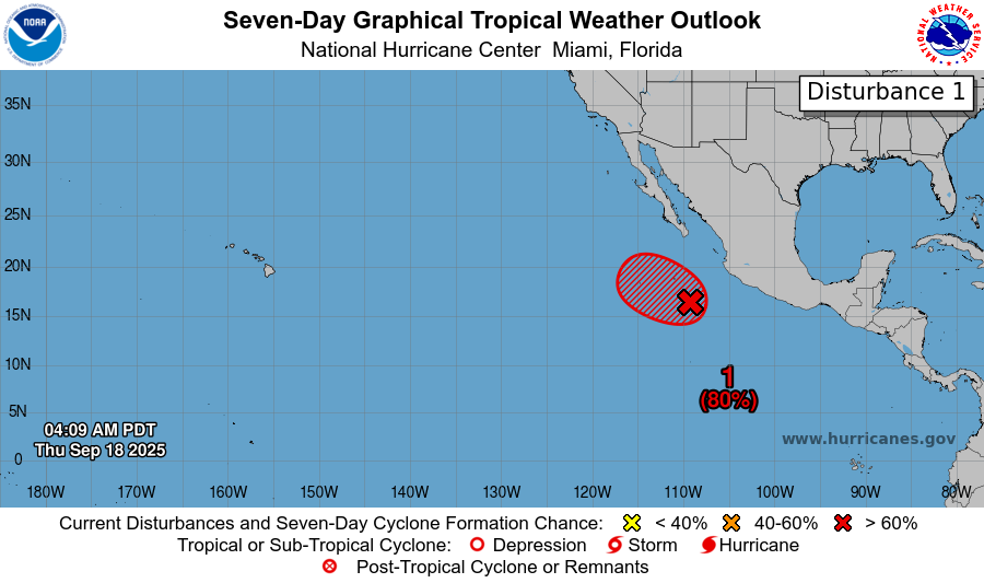 The Pacific Basin features one area to watch, Invest 96E, which has an 80 percent chance of developing into a tropical depression. Models are consistent with a turn to the west southwest due to being essentially ripped aprt by wind shear.