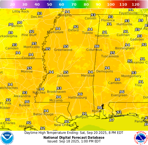 Saturday: A slight chance of showers and thunderstorms after 1pm. Sunny with highs in the mid 90s. Winds light, becoming northeast around 5 mph. Chance of rain 20 percent.
