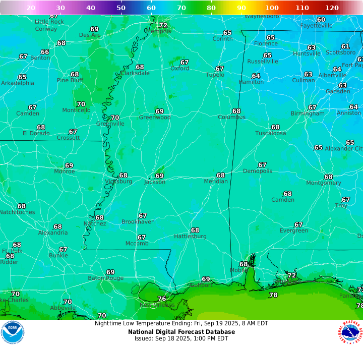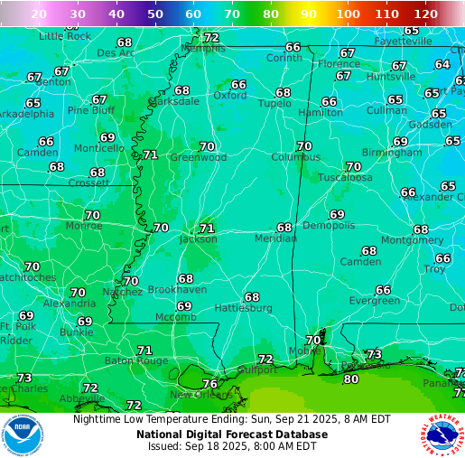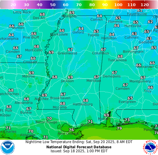 Friday Night: Mostly clear with lows in the upper 60s. Calm winds.