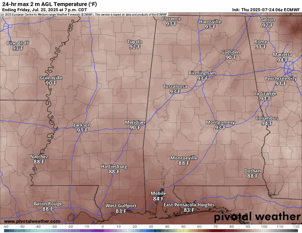 High Temperatures for Today 7/25/25 // Courtesy: Pivotal Weather
