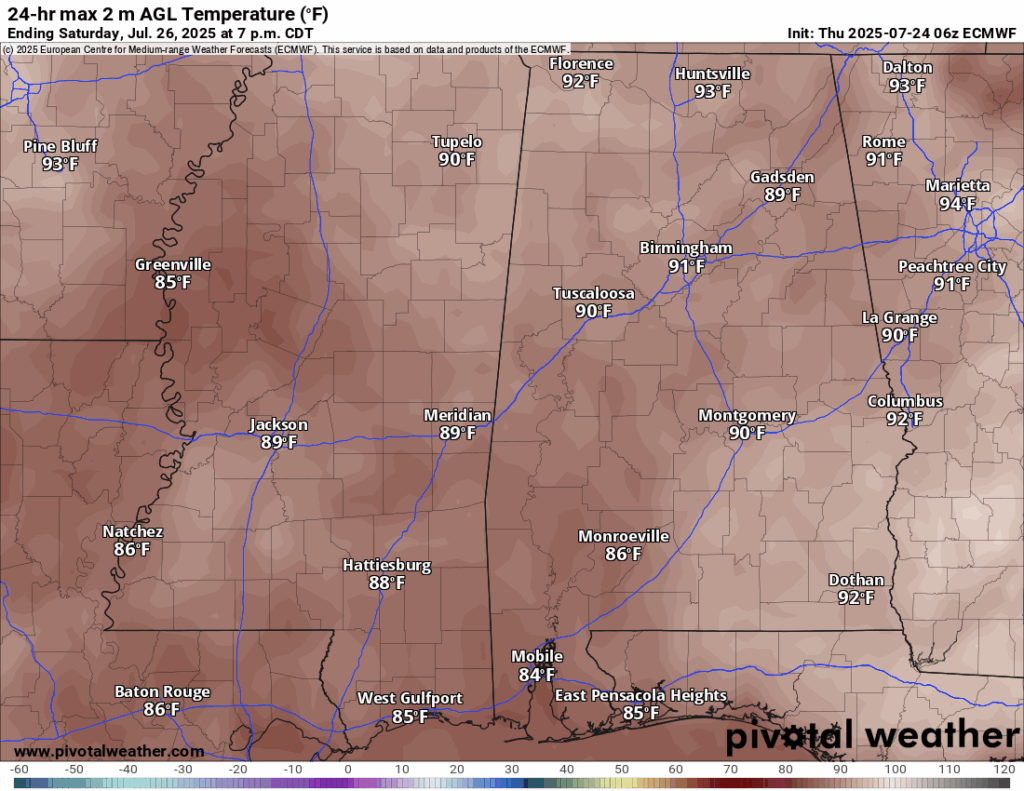 High Temperatures on Saturday 7/26/25 // Courtesy: Pivotal Weather