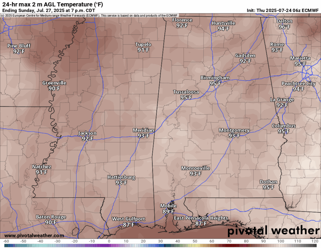 High Temperatures on Sunday 7/27/25 // Courtesy: Pivotal Weather