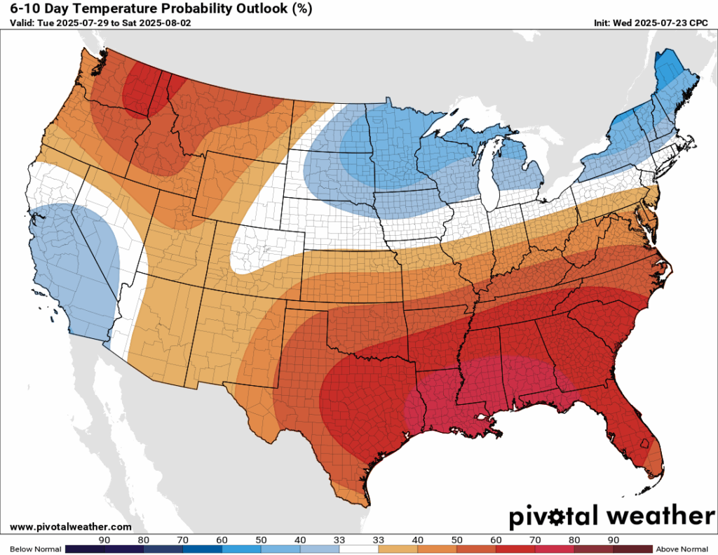 As we look ahead into late next week into next weekend, which is the first weekend in August, temperatures are looking to be very likely above average for our region. We could also see some more of the same in regards to rainfall, which is above average – but there is a low probability of that at this time.