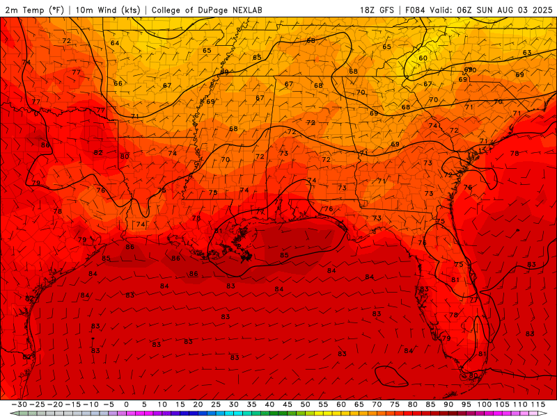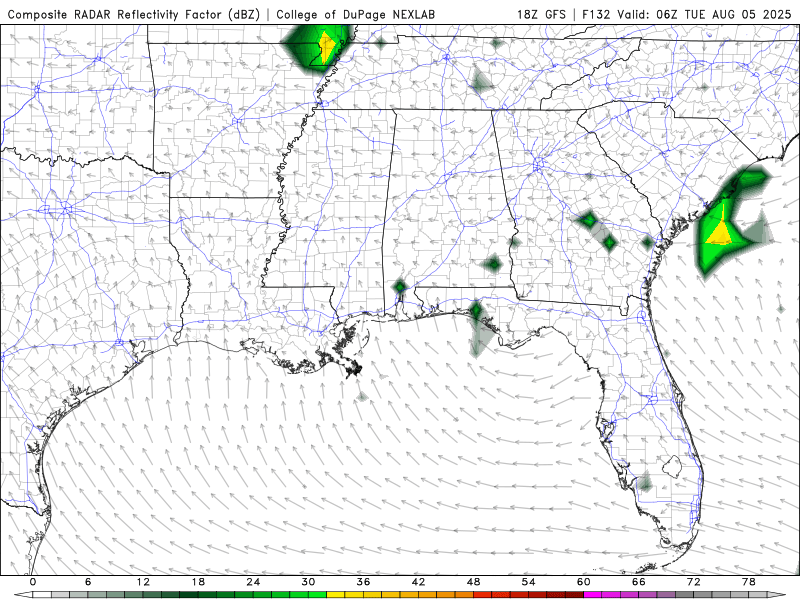 Wednesday – Continued hot and mostly sunny. Spotty afternoon storms possible in Louisiana and Mississippi. Alabama stays mostly dry. Highs near 94–96°F. Heat index values reach 108–110°F. South winds 5 to 10 mph.