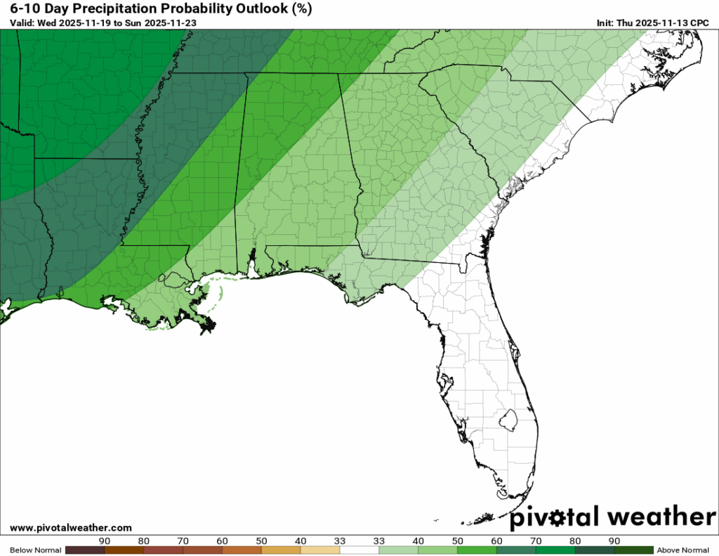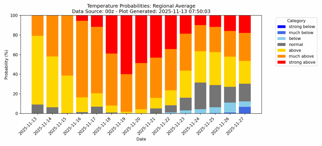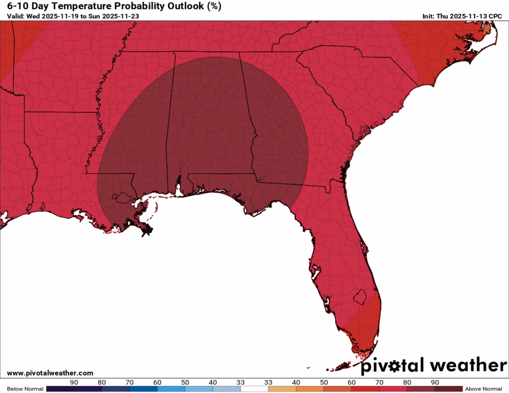 The warm trend does not seem to let up on the 6-10 day outlook OR on the temperature probability chart that Nick has made. We’re very likely going to stay above average for this time of year through about Thanksgiving. Confidence drops after that, but the pattern still leans warmer than colder for the near future.