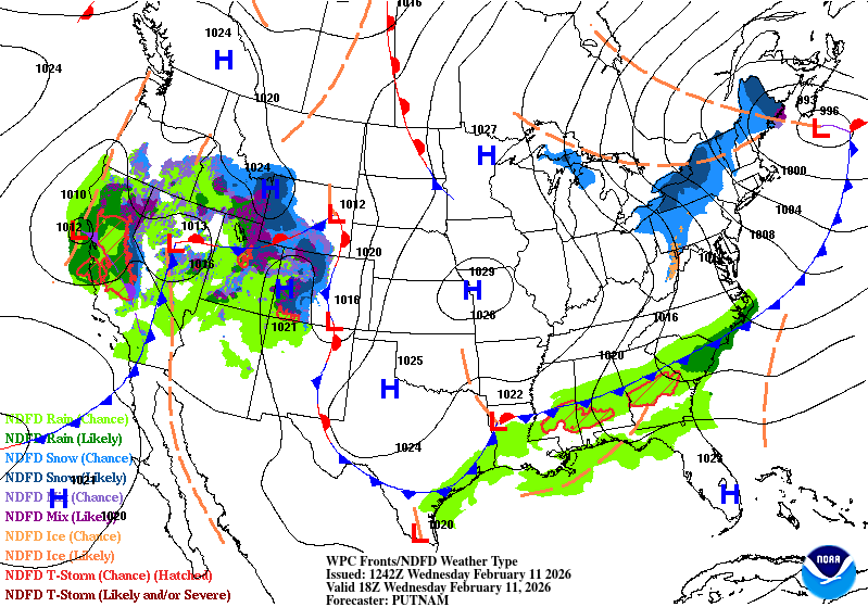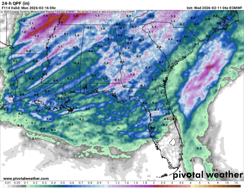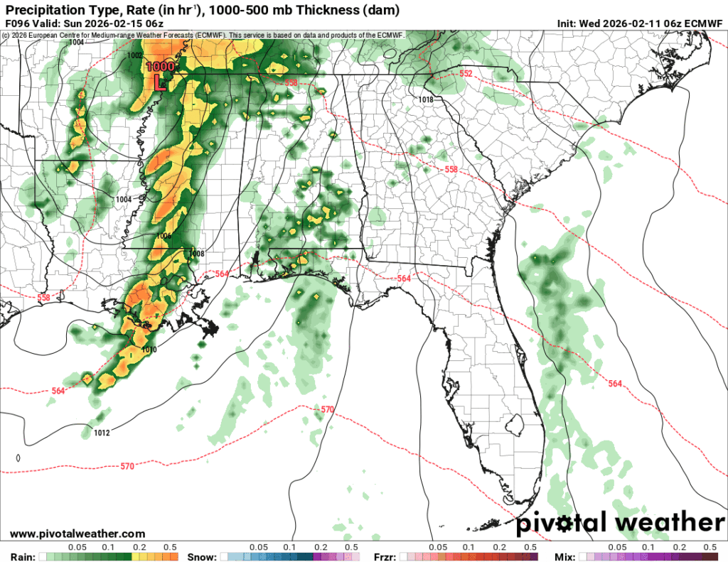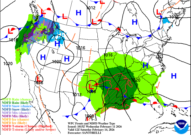 The good news is, not a lot of rain expected on Valentine’s Day! A few stray showers are expected during the day, but otherwise we won’t expect much until the front reaches us closer to midnight. The SPC has not put out any outlook on the incoming storm and right now, there doesn’t seem to be a lot of potential with these storms so far. Lightning, locally heavy rain, and wind gusts are the main risks associated with this system. Overall, it’s going to be a bit cooler during the day from the cloud cover, but severe weather potential looks fairly limited.