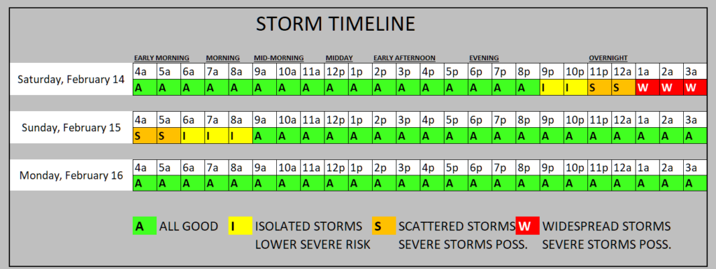 Here is a quick look at the timeline for storms. While this is a general outlook, you can easily make it slightly more applicable to your specific location. If you live farther west, move the timing up about an hour or two. If you live farther east across our area, move this timeline back an hour or two.