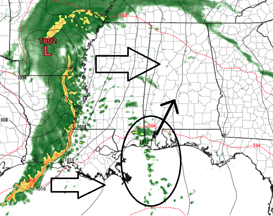 On top of that, there is some indication that a daisy-chain of storms may develop ahead of the line somewhere (on this map it is near the Mississippi / Alabama border and down into the Gulf, but the location isn’t set in stone) and those storms may have a bit more of a propensity to spin and produce some hail. The tornado risk from those storms is going to be very conditional.