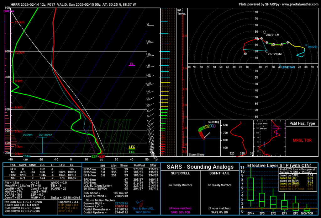 At the same time, picking a point near that daisy-chain cluster of storms, we see a bit more instability. And we continue to see good shear and a solid wind profile.