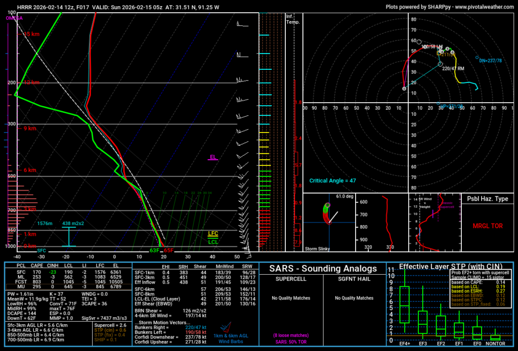 In this case, we have plenty of wind, it is turning with height, there is ample shear, too. But we have a limited amount of mixed-layer instability (ML CAPE) and even our Downdraft CAPE isn’t too high.