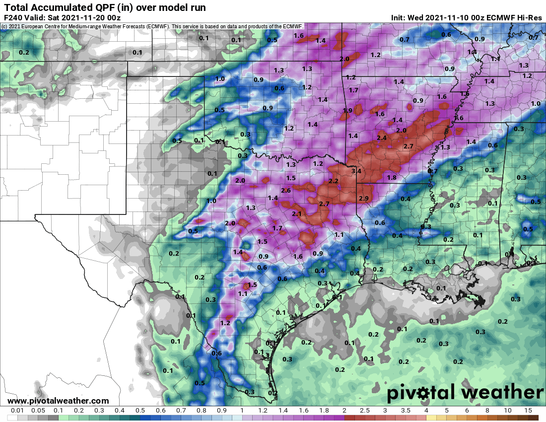 Outside of this chance for rain, there isn’t much else on the horizon. Rainfall estimates from the ECMWF model show less than 1″ of rain through the next 10 days across the region.
