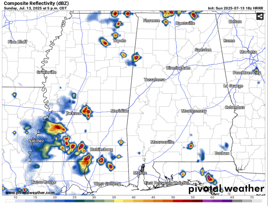 Today has been another hot one with more storms developing across southwestern Louisiana moving northeast across southwest Mississippi and the Pine Belt. Expect these to hit by mid-afternoon and last until around sunset. Highs will reach the 90s with a heat index around 100 before the storms cool things off.