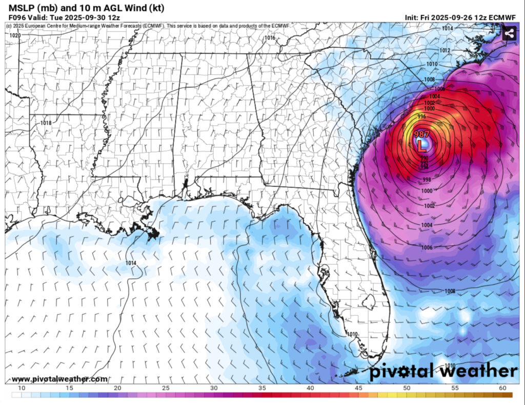 Plots have 94L reaching on average Category 1 hurricane status. If you’re in the coastal GA/SC/NC area, I would watch out for storm surge, flooding, and high winds if this thing makes it. This isn’t to overhype or scare anyone, but there is a likelihood that this system will make it somewhere up the Atlantic coastline.