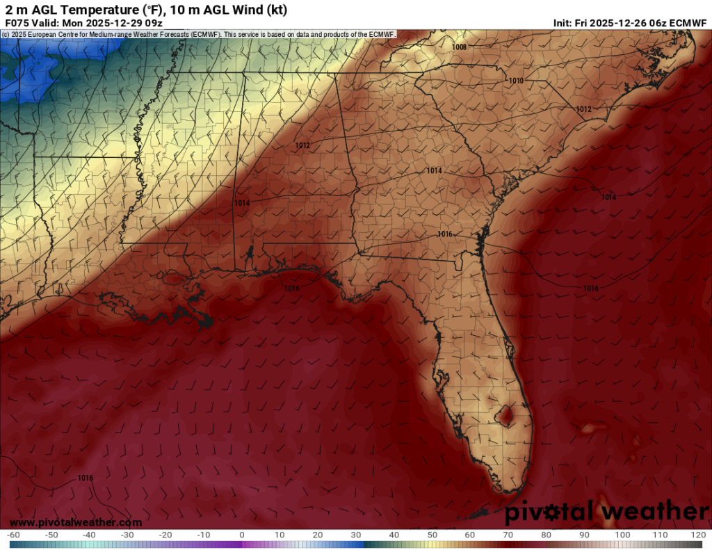 2 meter temperature and wind showing the cold front moving in early Monday morning //Courtesy: Pivotal Weather