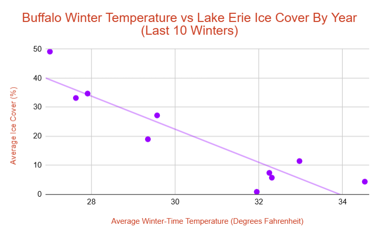 Using data from the NOAA CoastWatch Great Lakes Regional Node, and from the NWS Buffalo Weather Forecast Office, I built this graph examining the co-orelation between the average temperature in meteorological winter (defined as the whole months of December, January, and February) in Buffalo, NY, and the average percentage of Lake Erie that was frozen during meteorological winter. I did this for each of the last 10 winters.