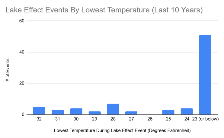 The NWS Buffalo WFO compiles an archive of lake effect snow events. There’ve been 85 total Lake Erie-influenced snow events in the past 10 years, each of which were examined in this research.