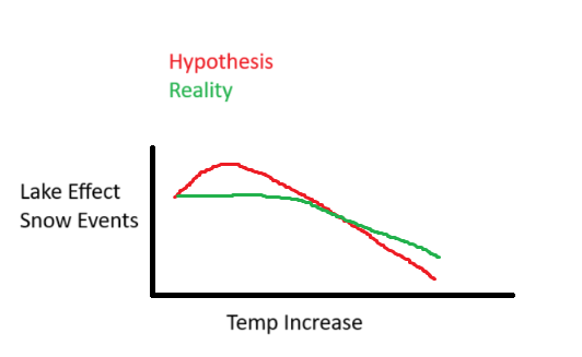 The conclusion puts into question the hypothesis. Yes, the upper bounds (above 60% ice cover) are slightly less conducive for lake effect than the 40-60% range. But the frequency drops off after 40%, likely due to warmer temperatures. If you had a winter where the ice cover hovered in the 40-60% range for a long period of time, instead of spiking above 60%, then you would see more lake effect snow events. But you could also easily imagine a year where a lot of would be 40-60% days are instead below 40%, causing a decrease in lake effect snow events. And you have to remember that each degree you’re warming will cause an average of 0.33 fewer snow events per year.