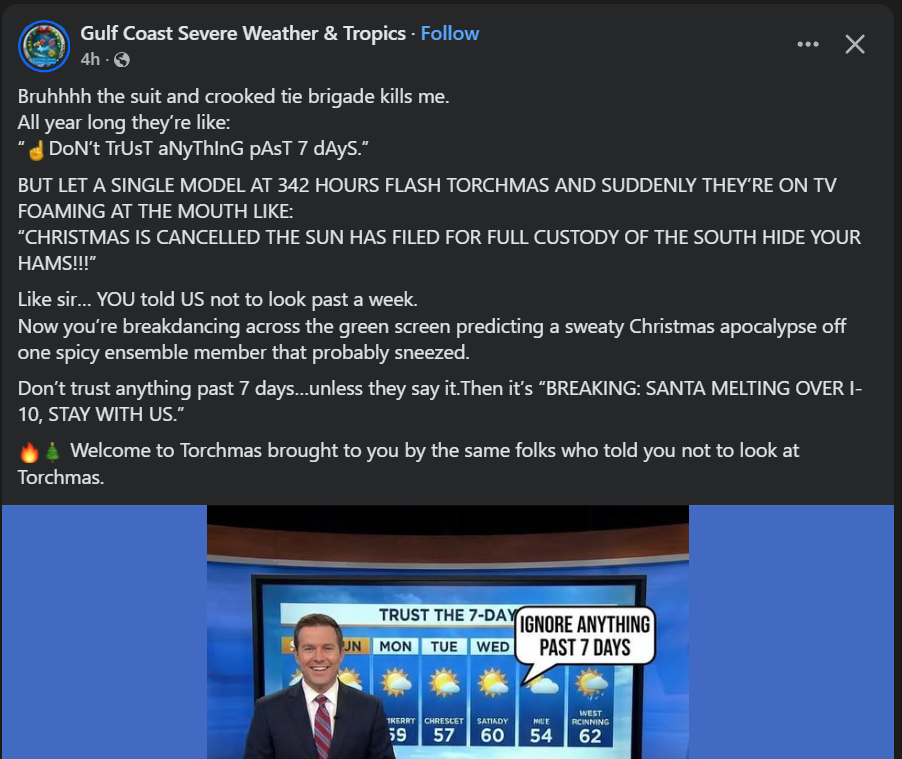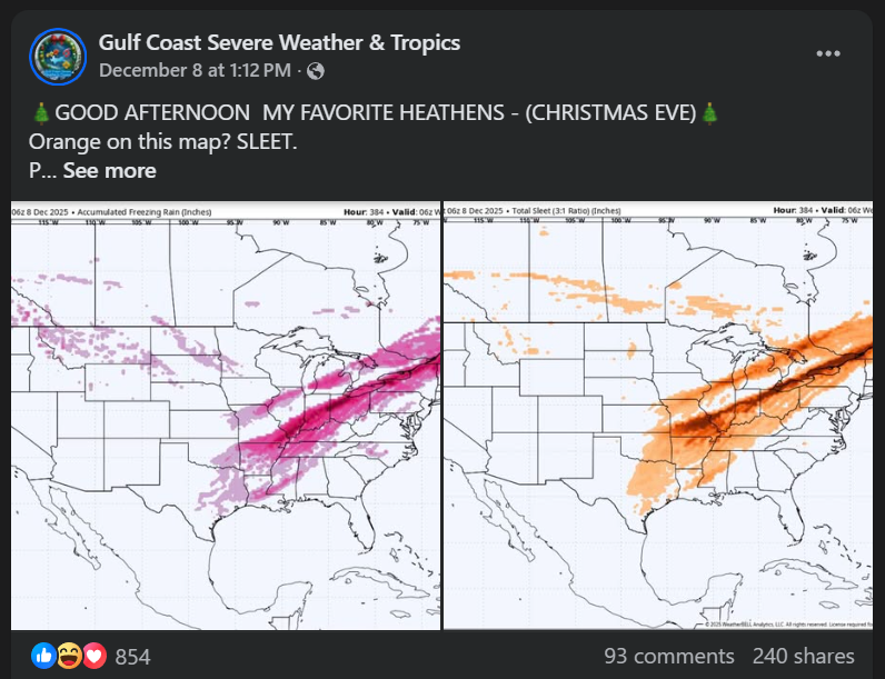 Like this post from the same page about Christmas Eve just two days ago. The post shows a single model (there are more than 10 now, I’m pretty sure, that can see that far into the future) showing sleet and freezing rain across a large area of the eastern US.