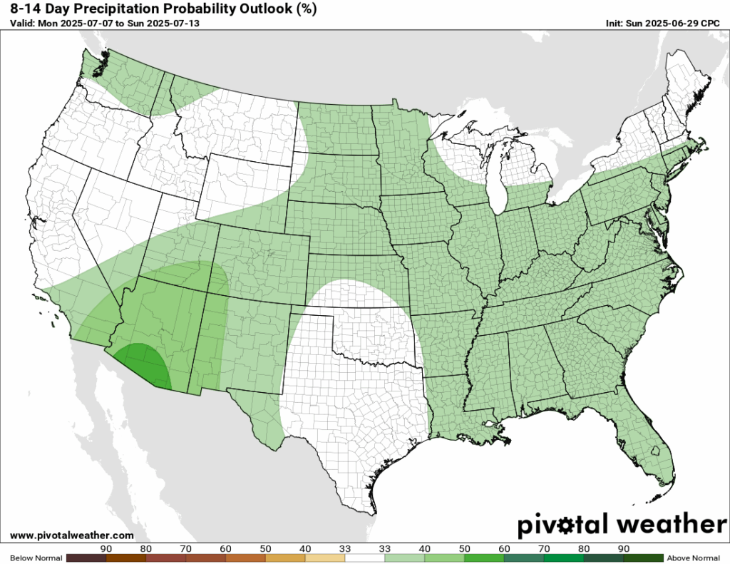Here’s a look at the GEFS modeled precipitation anomalies through July 7th 06z. Green indicates above average precipitation, white indicates average precipitation, and yellow indicates below average precipitation. Let’s look into the details by region: