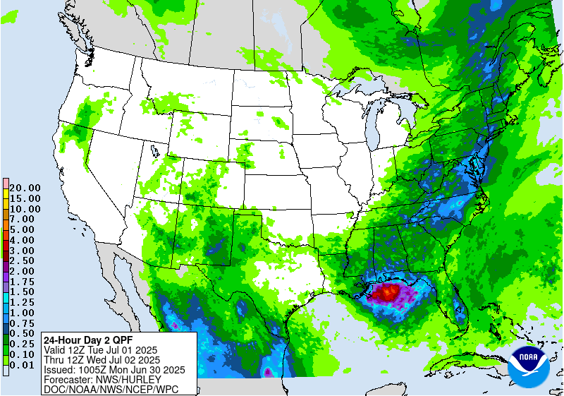 Forecasted Rain Totals for Today 7/1/25 // Courtesy: wpc.ncep.noaa.gov