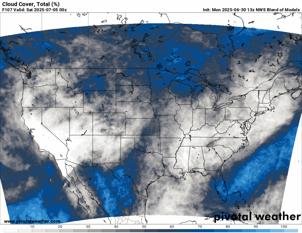 Cloud Cover Forecast for July 4th from NWS Blend of Models // Courtesy: Pivotal Weather