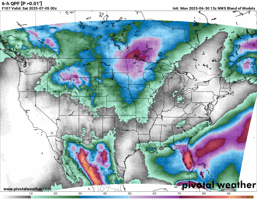 6 Hour Rainfall > 0.01 inches for July 4th // Courtesy: Pivotal Weather